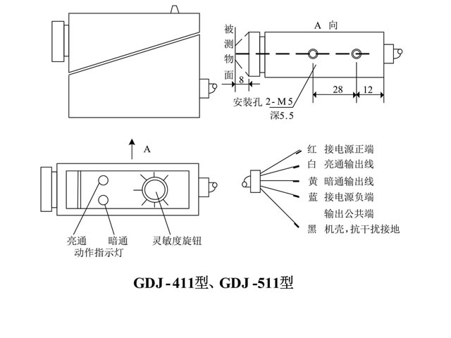 GDJ系列色标传感器(俗称光电头,光电眼)采用光发射接收原理,发出调制光,接收被测物体的反射光,并根据接收信号的强弱来区分不同的颜色,或判别物体的存在与否。在软包装机械、印刷机械、食品机械、纺织及造纸机械的自控系统中作为传感器与其它电路或装置配套使用、对印刷在某种颜色背景上的色标,或其它可作为标记的图案色块、线条,或物体的有无进行检测,可实现自动定位、定长、辨色、纠偏、对版、计数等功能。